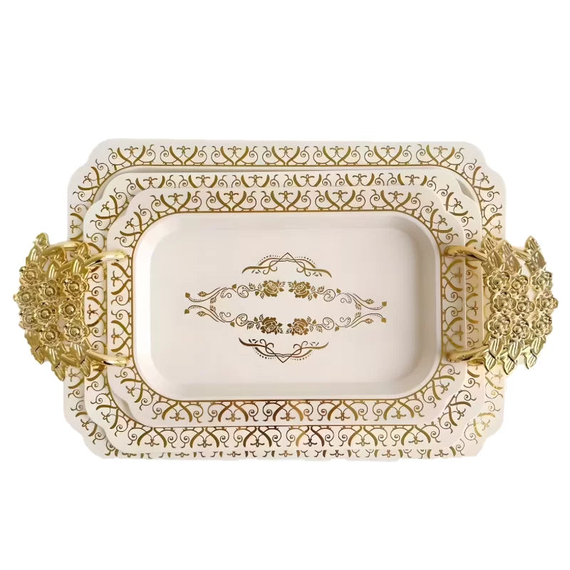 White Serving Tray with Gold Rose Handle – Set of 3 is backordered and will ship as soon as it is back in stock.