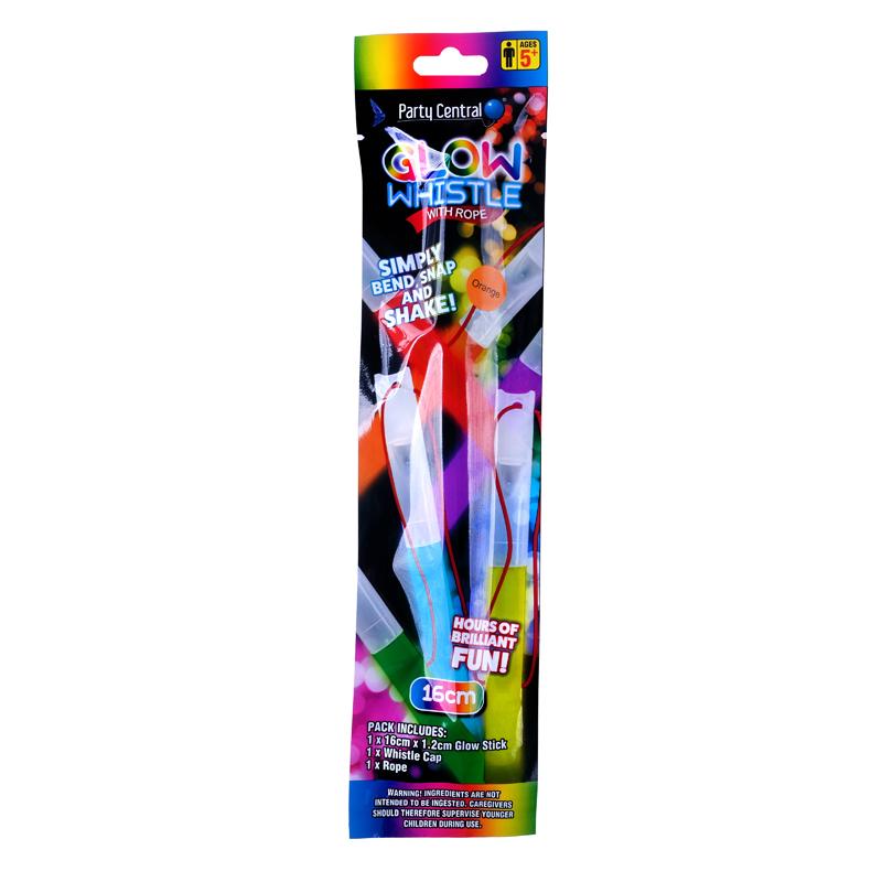 Glow Whistle with Rope - 16cm x 1.2cm - Assorted Colours Green, Yellow, Blue, Red, Purple, Orange