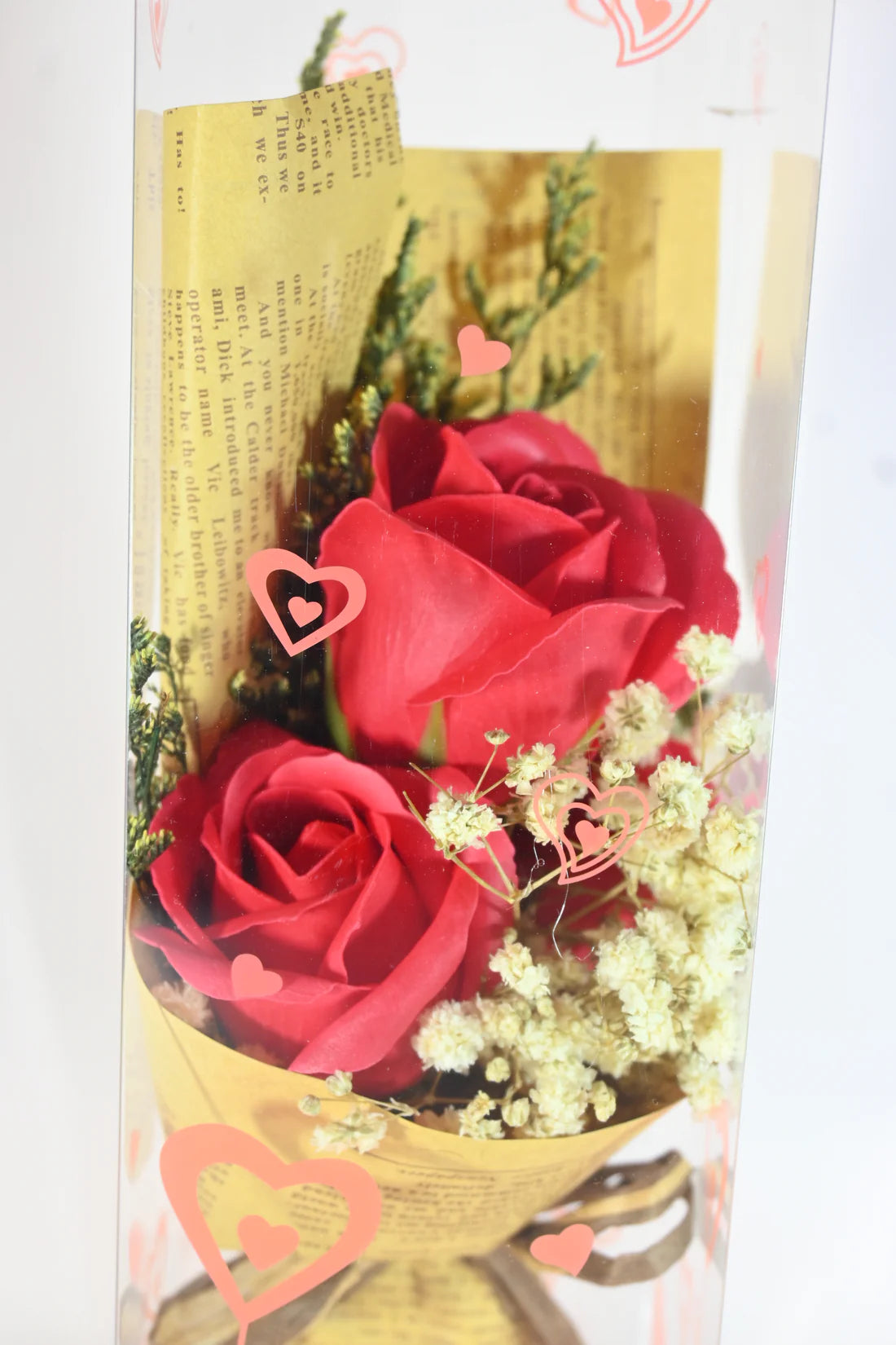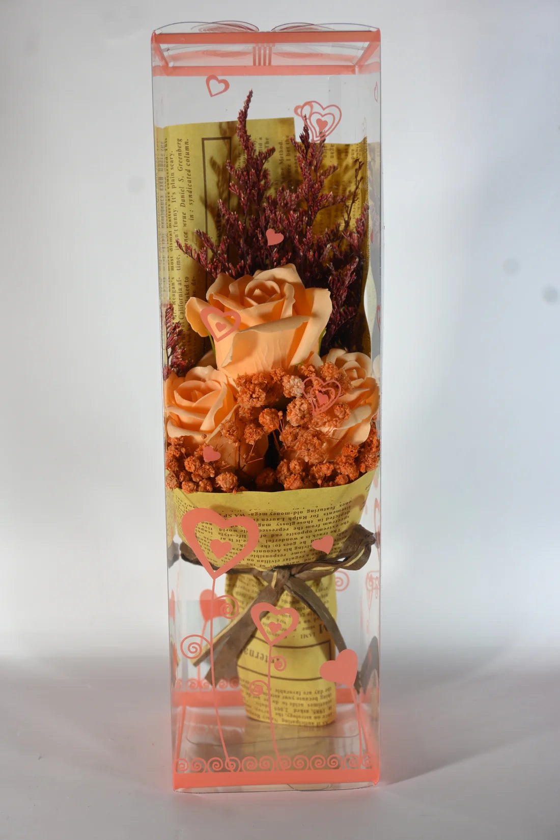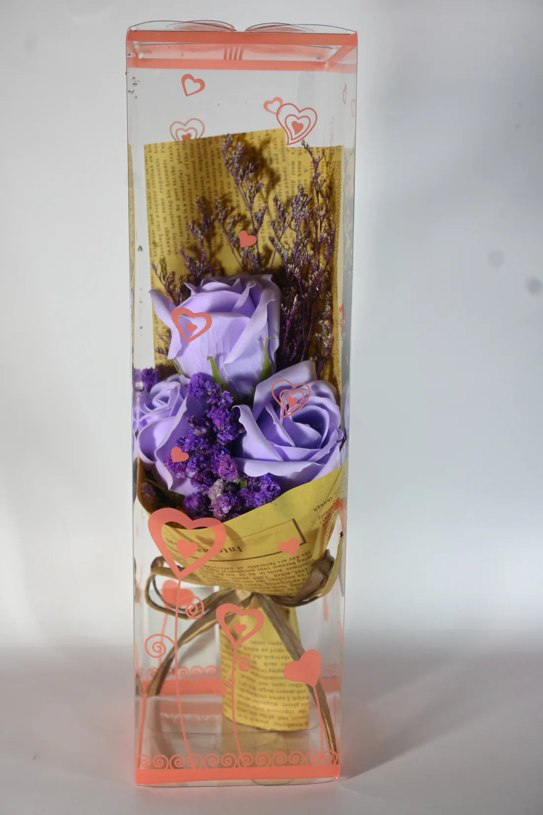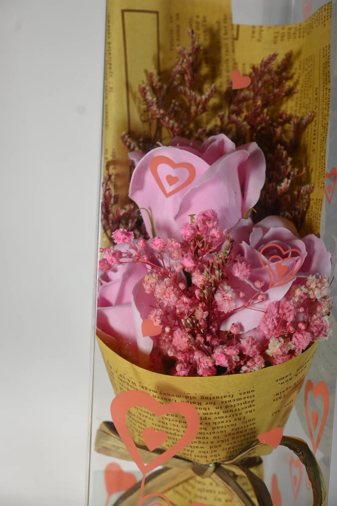 Charming Packaging: The flowers are wrapped in vintage-style paper, adorned with charming heart-shaped designs on the box, and tied with a rustic ribbon. This thoughtful packaging makes it an ideal gift for various occasions.