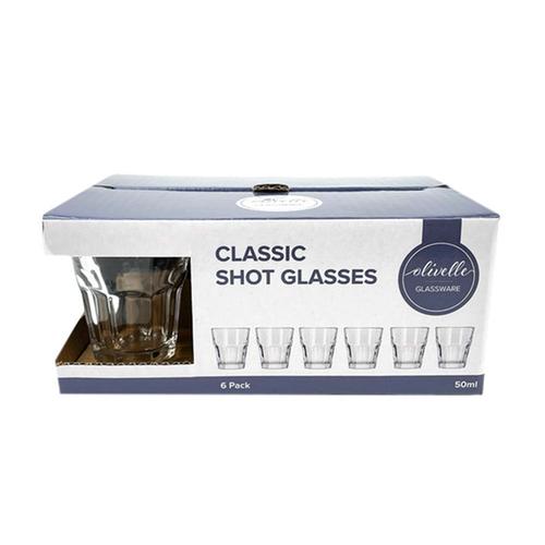 Clear Glass Classic Shot 50ml pk6 Set of six durable shot glasses crafted from premium clear glass, each holding a precise 50ml capacity. These versatile vessels are ideal for spirits, liqueurs, and mixed shots, offering excellent clarity to showcase your beverages.