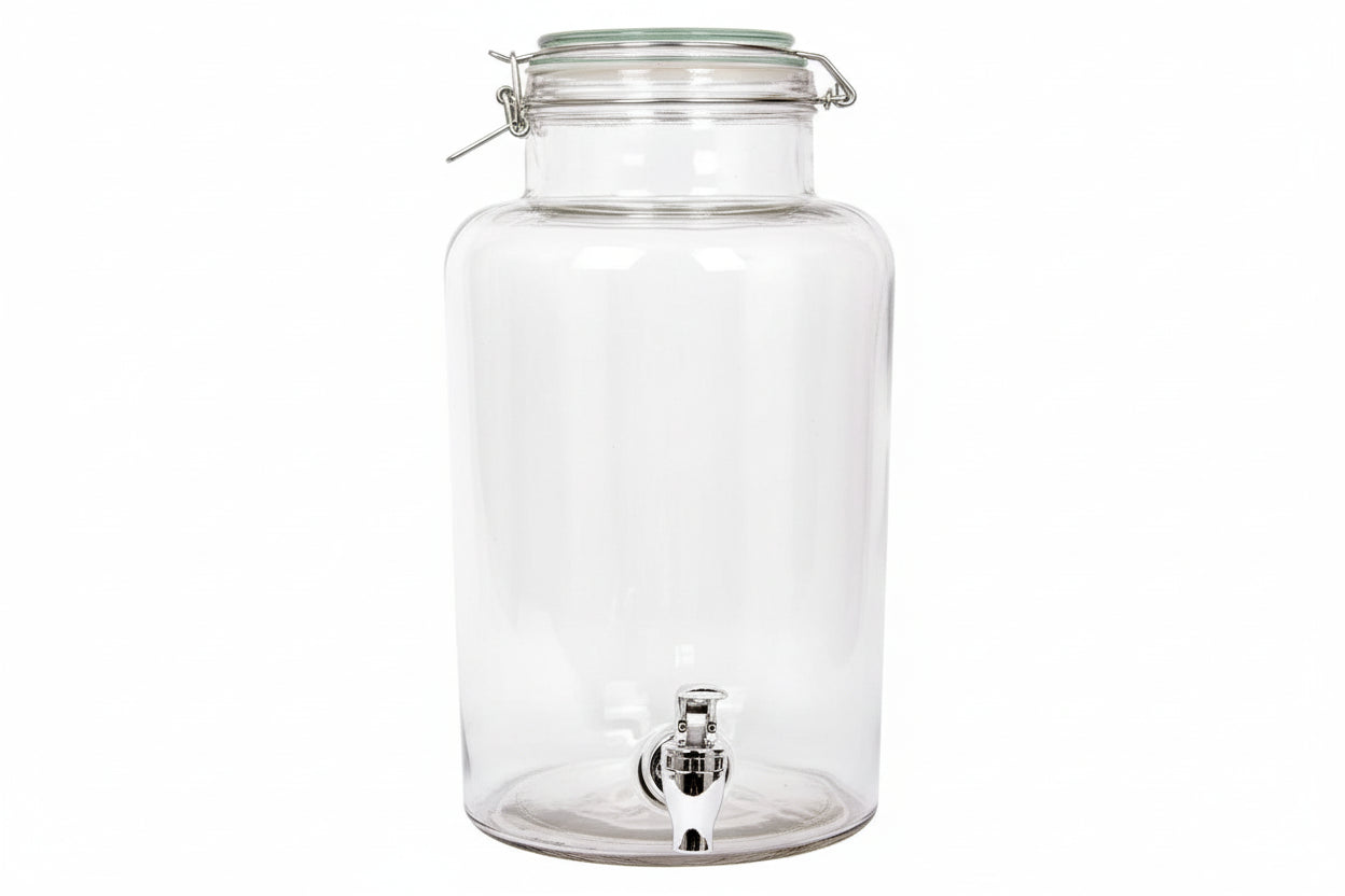 Glass Dispenser Clip Lid 3.5L This durable glass dispenser combines practical functionality with elegant design, ideal for serving beverages at events, gatherings, or everyday use. The 3.5-litre capacity accommodates generous quantities, while the secure clip-lock lid prevents spills and keeps contents fresh. The transparent glass construction allows easy monitoring of liquid levels, and the smooth finish facilitates effortless cleaning. Perfect for juice, water, punch, or other beverages, this dispenser delivers reliable performance for both commercial and residential settings.