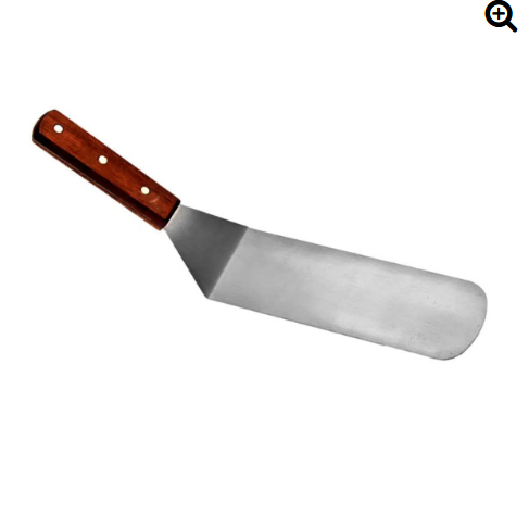 The commercial grade pancake turner features a strong stainless steel turner head and complete durable wood handle. Rivets in handle to increase strength.